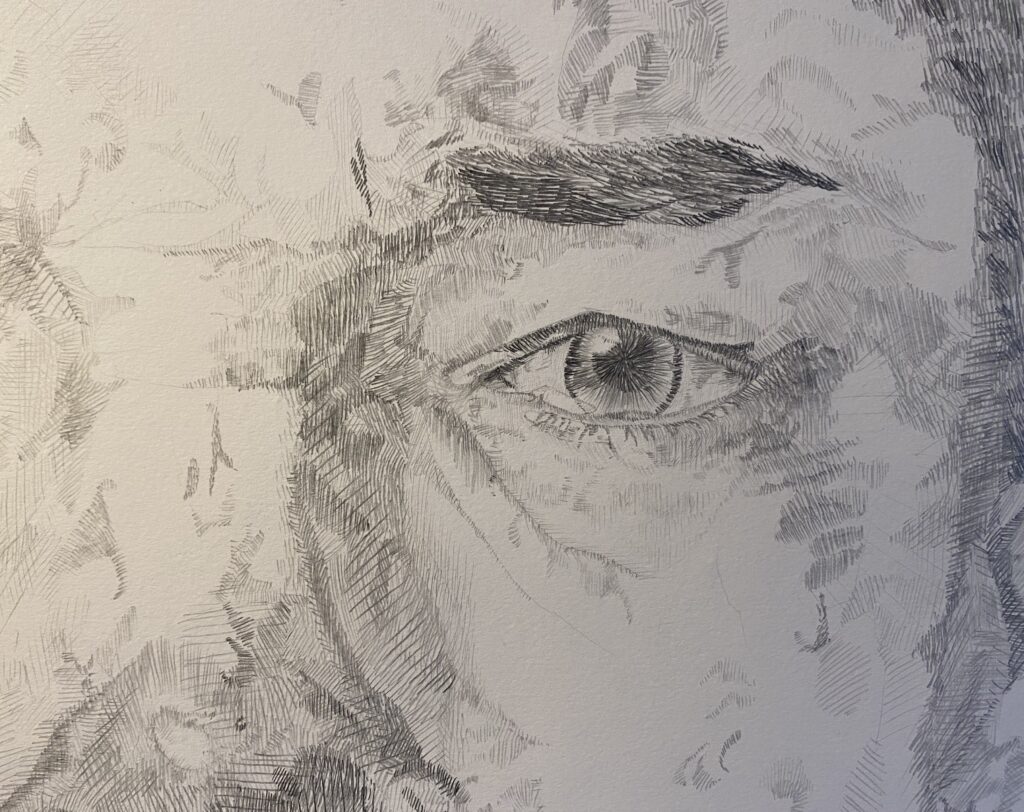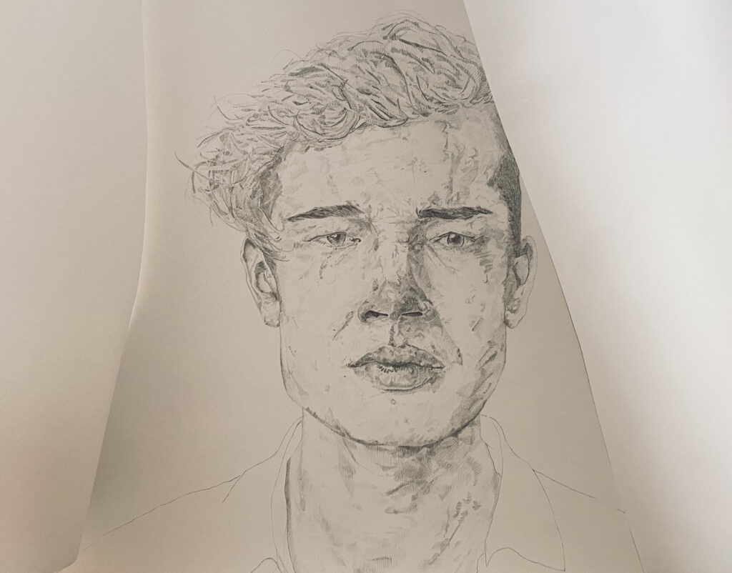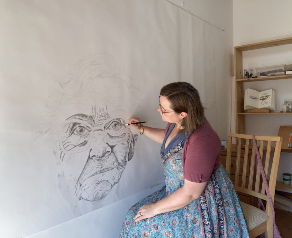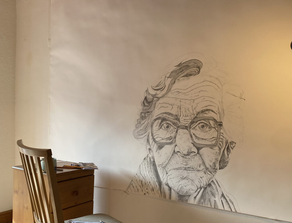 In preparation for a solo exhibition in January 2024, Sarah undertook a three artist residency in Working Artist Studios, to make a pair of large scale works. ‘Love & Loss’ explores a story of survival after loss, with layers of stories told through this work is completes the body of work ‘This is for You’. The collection explores some difficult conversations and includes drawings that are based on social crises, address division and inequality and reflect on humanity and healing.